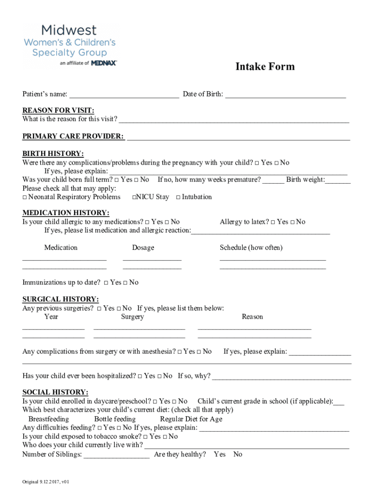 Intake Formations name: Date of Birth: REASON FOR VISIT: What is the reason for this visit? PRIMARY CARE PROVIDER: BIRTH HISTORY: Were there any complications/problems during the pregnancy with your