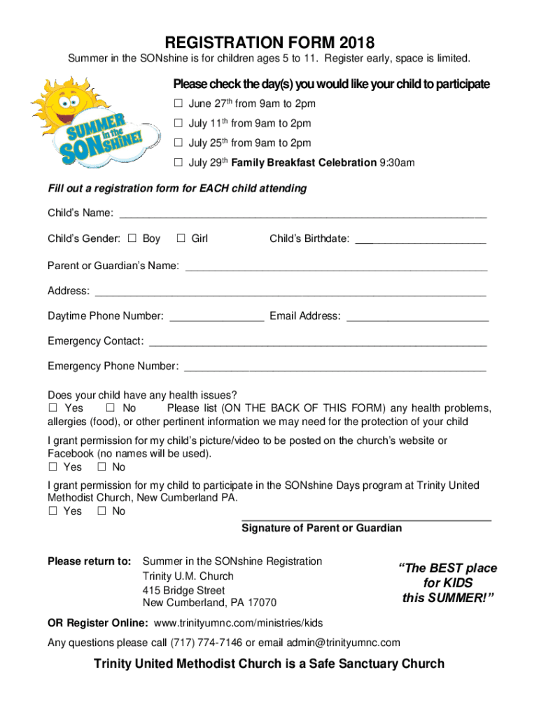 REGISTRATION FORM 2018 Summer in the Sunshine is for children ages 5 to 11. Register early, space is limited. Please check the day(s) you would like your child to participate June 27th from 9am to