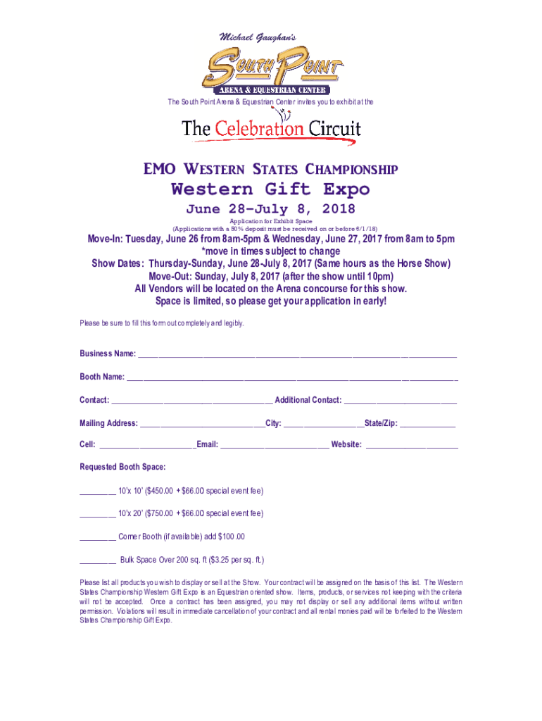 The South Point Arena & Equestrian Center invites you to exhibit at them W st RN St t s Ch mpionshipWestern Gift Expo June 28July 8, 2018 Application for Exhibit Space (Applications with a 50% deposit