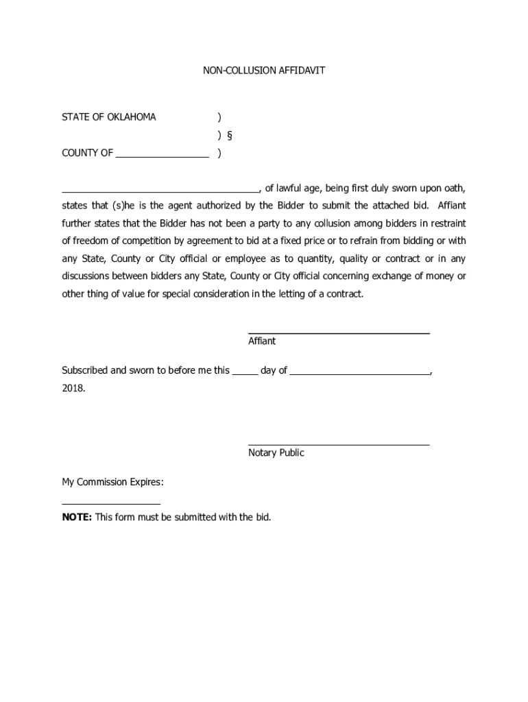 CONCLUSION AFFIDAVITSTATE OF OKLAHOMA)) COUNTY OF), of lawful age, being first duly sworn upon oath, states that (s)he is the agent authorized by the Bidder to submit the attached bid. Affine further