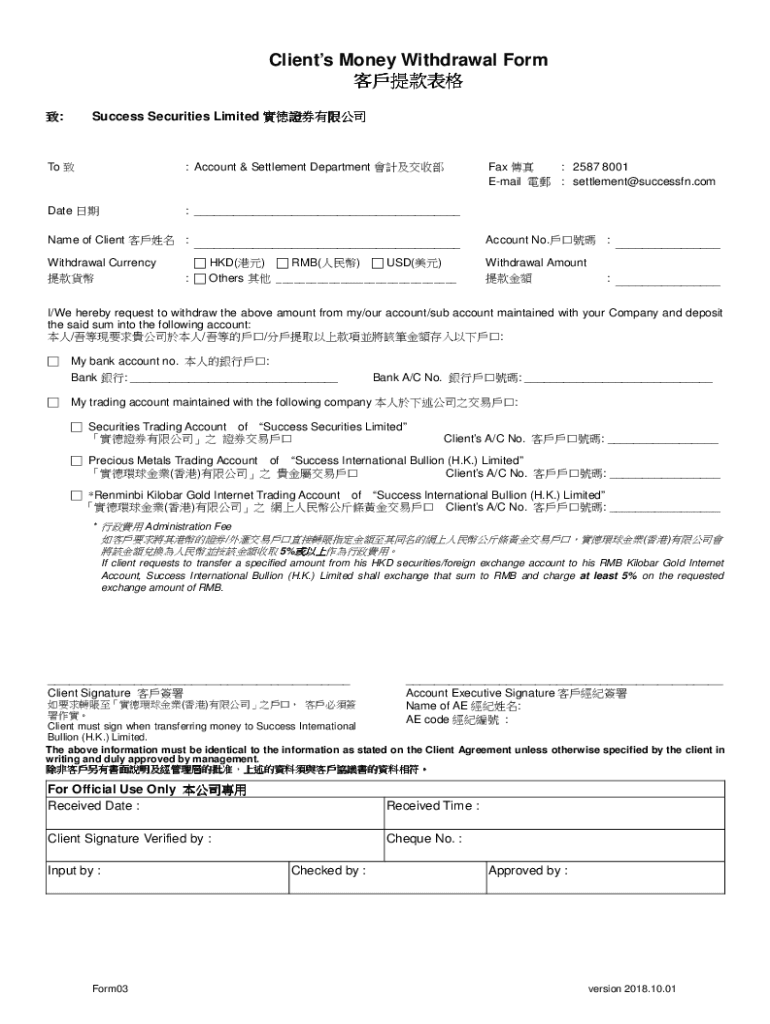 Clients Money Withdrawal Form :Success Securities Limited To : Account & Settlement Department Fax : 2587 8001 Email : settlement success. Combat : Name of Client : Account No. Withdrawal Currency