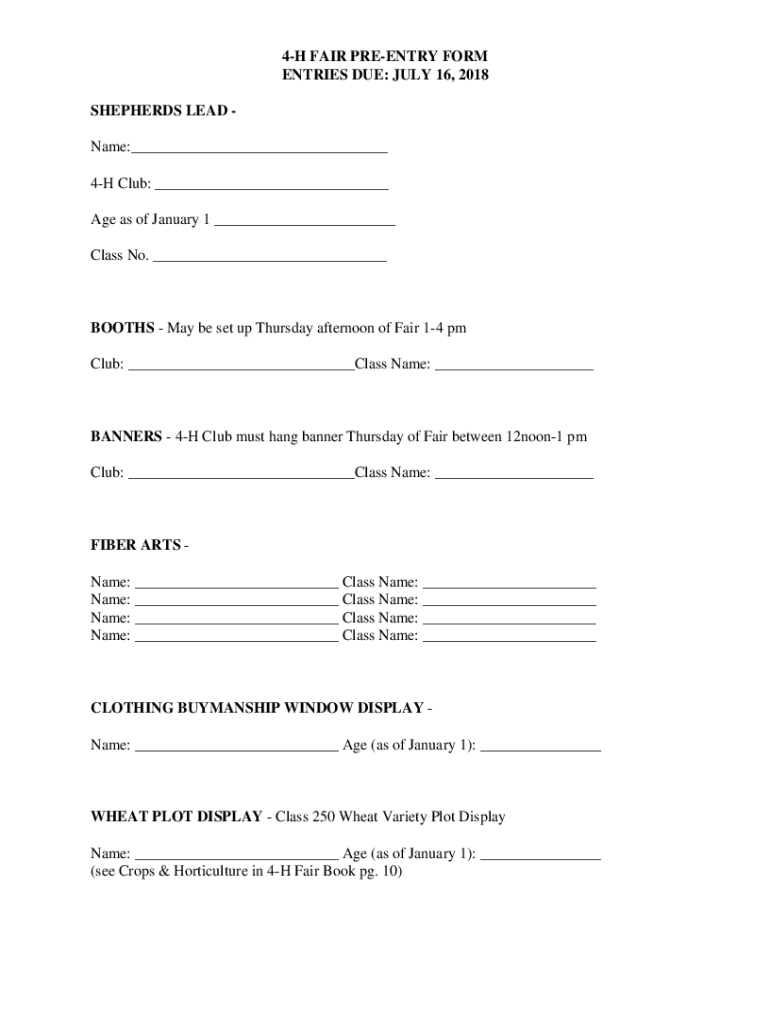 4H FAIR REENTRY FORM ENTRIES DUE: JULY 16, 2018, SHEPHERDS LEAD Name: 4H Club: Age as of January 1 Class No. BOOTHS May be set up Thursday afternoon of Fair 14 pm Club: Class Name: BANNERS 4H Club