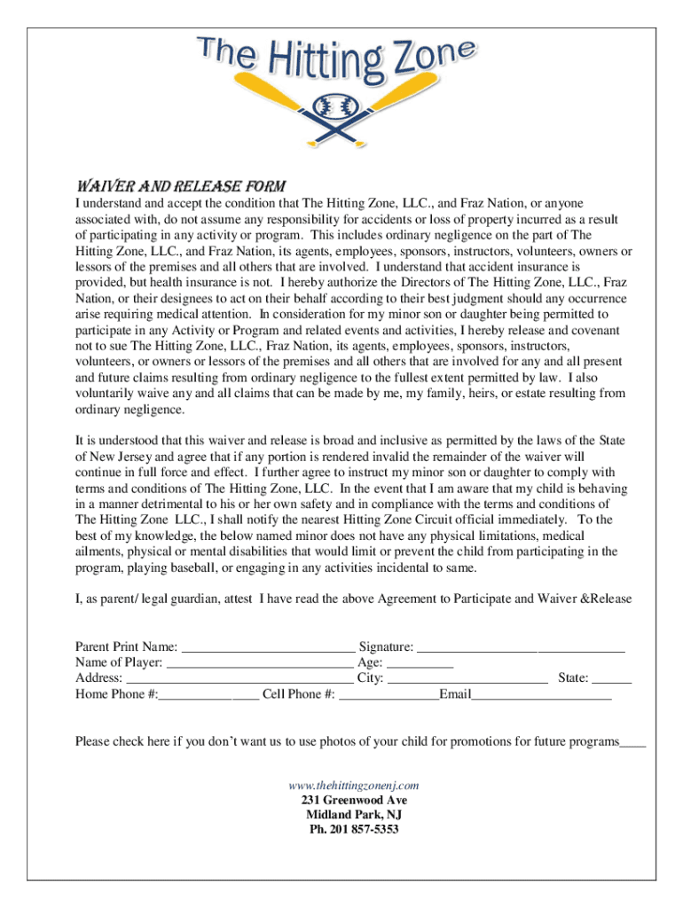 Get the free Waiver and releasE fORM - The Hitting Zone