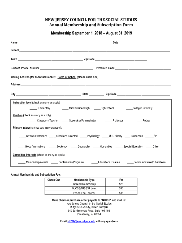 NEW JERSEY COUNCIL FOR THE SOCIAL STUDIES Annual Membership and Subscription Form Membership September 1, 2018, August 31, 2019, Name Date School Town Zip Code Contact Phone Number Preferred Email