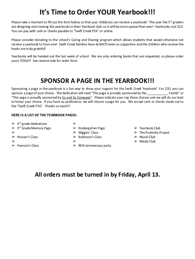 Please take a moment to fill out the form below so that your child(men) can receive a yearbook! This year the 5th graders