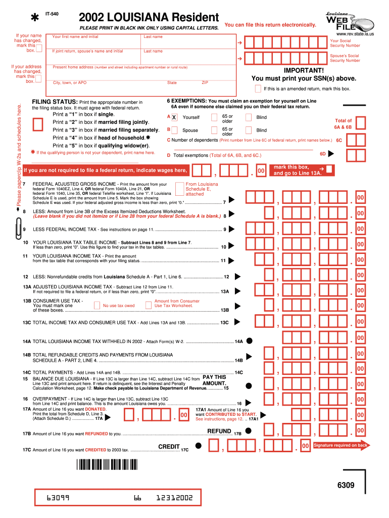 The Louisiana Individual Income Tax Return is a state tax form used by residents of Louisiana to report their annual income and calculate tax owed to the state for the year 2002.