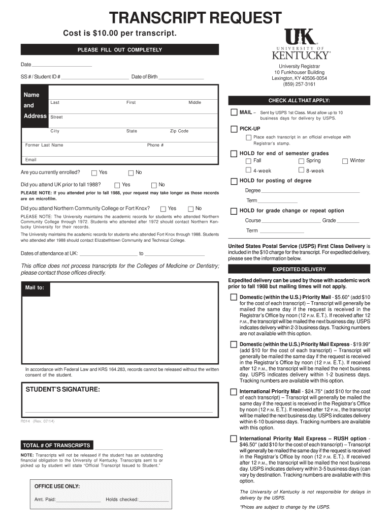 Get the free Transcript Request Form - University of Kentucky - uky