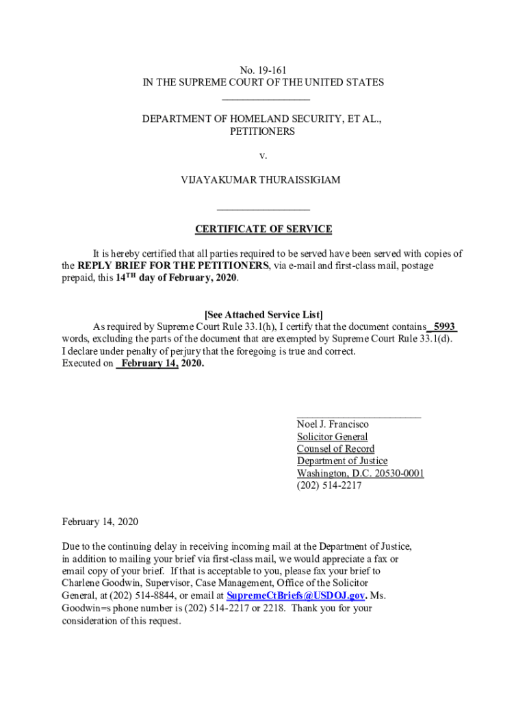 No. 19161 IN THE SUPREME COURT OF THE UNITED STATES DEPARTMENT OF HOMELAND SECURITY, ET AL., PETITIONERS v. VIJAYANAGAR THURAISSIGIAM CERTIFICATE OF SERVICE It is hereby certified that all parties