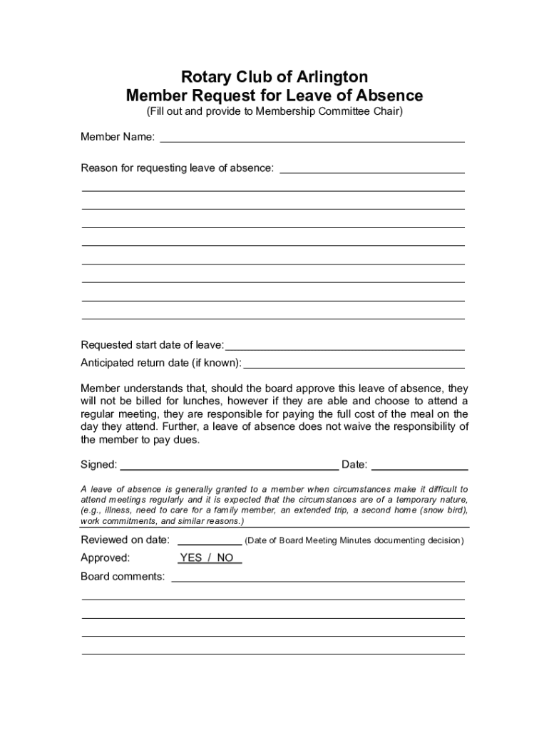 Rotary Club of Arlington Member Request for Leave of Absence (Fill out and provide to Membership Committee Chair) Member Name: Reason for requesting leave of absence: Requested start date of leave: