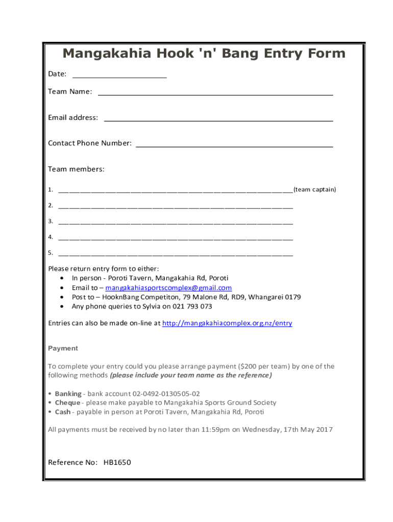 Mangakahia Hook 'n Bang Entry Form Date:Team Name:Email address:Contact Phone Number:Team members:1. (team captain)2. 3. 4. 5. Please return entry form to either: In person Port Tavern, Mangakahia