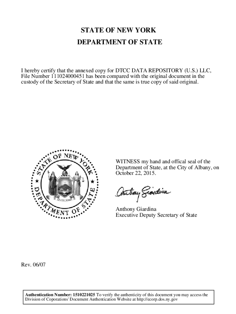 STATE OF NEW YORK DEPARTMENT OF STATE hereby certify that the annexed copy for DCC DATA REPOSITORY (U.S.) LLC, File Number 111024000451 has been compared with the original document in the custody