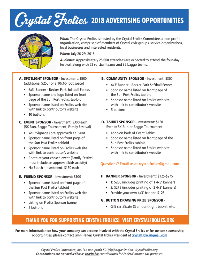 2018 ADVERTISING OPPORTUNITIES What: The Crystal Frolics is hosted by the Crystal Frolics Committee, a nonprofit organization, comprised of members of Crystal civic groups, service organizations,