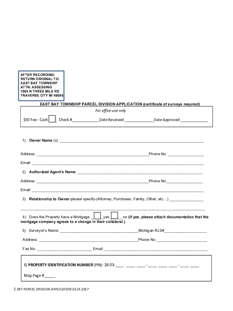 AFTER RECORDING: RETURN ORIGINAL TO: EAST BAY TOWNSHIP ATTN: ASSESSING 1965 N THREE MILE RD TRAVERSE CITY MI 49696EAST BAY TOWNSHIP PARCEL DIVISION APPLICATION (certificate of surveys required)Forofficeuseonly