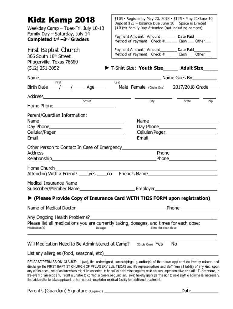 Kids Camp $2018105 Register by May 20, $2018125 May 21June 10 Deposit $25 Balance Due June 10 Space is Limited $10 Per Family Day Attendee (not including camper)Weekday Camp Tues Fri. July 1013 Family