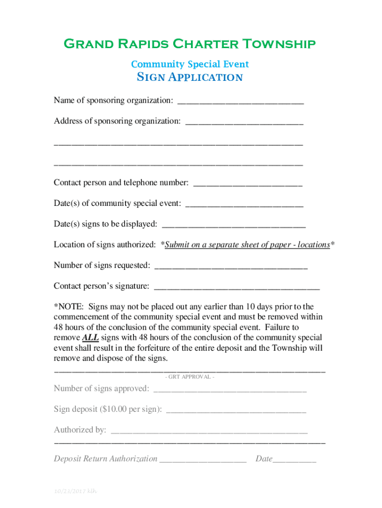 Grand Rapids Charter Township Community Special Eventing Application Name of sponsoring organization: Address of sponsoring organization: Contact person and telephone number: Date(s) of community