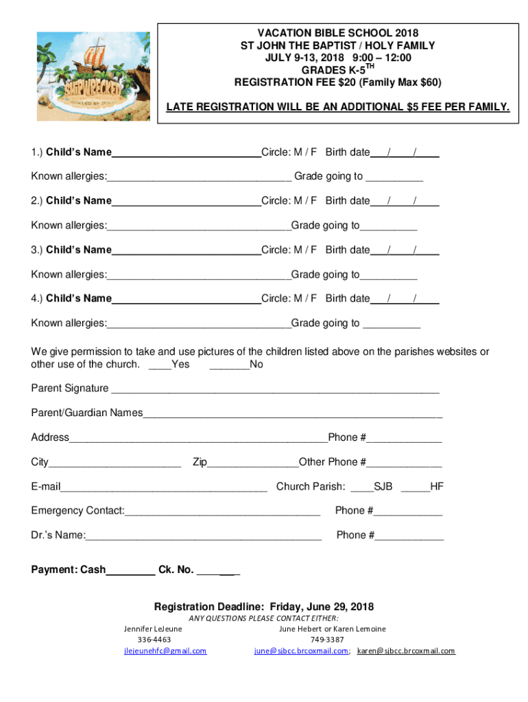VACATION BIBLE SCHOOL 2018 ST JOHN THE BAPTIST / HOLY FAMILY JULY 913, 2018 9:00 12:00 GRADES K5TH REGISTRATION FEE $20 (Family Max $60) LATE REGISTRATION WILL BE AN ADDITIONAL $5 FEE PER FAMILY.1.)