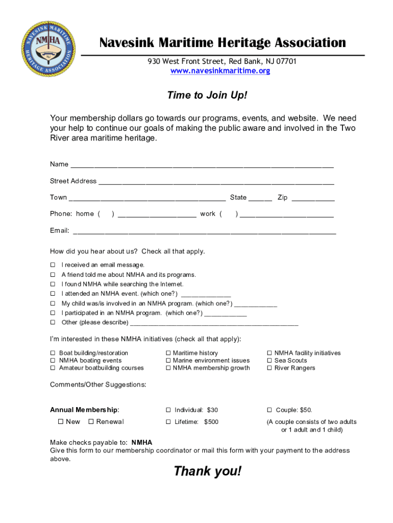 Nave sink Maritime Heritage Association 930 West Front Street, Red Bank, NJ 07701 www.navesinkmaritime.orgTime to Join Up! Your membership dollars go towards our programs, events, and website. We