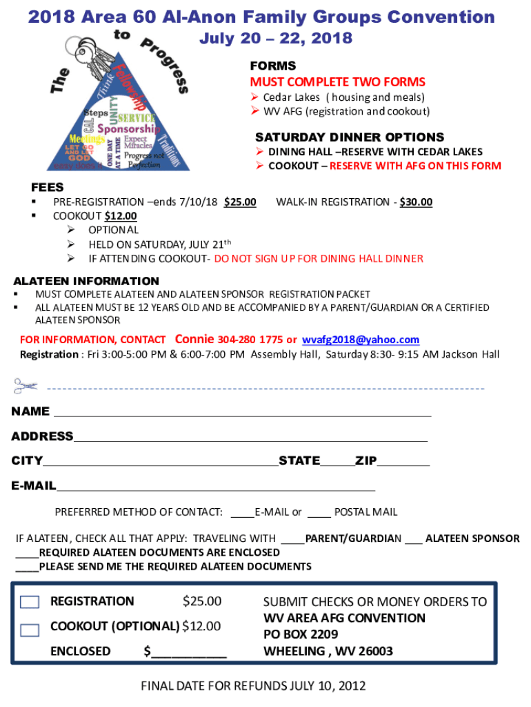 2018 Area 60 Alan Family Groups Convention July 20 22, 2018 FOREMOST COMPLETE TWO FORMS Cedar Lakes (housing and meals) WV AFG (registration and cookout) SATURDAY DINNER OPTIONS DINING HALL RESERVE