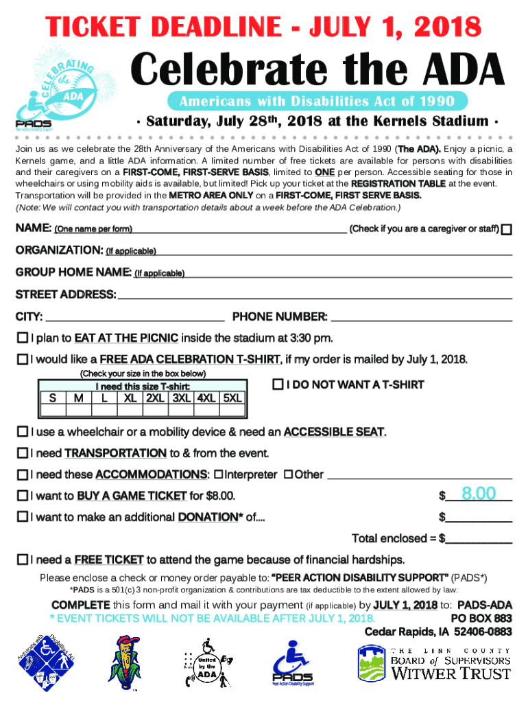 CELETICKET DEADLINE JULY 1, 2018Celebrate the ADAPTING Bathe ADA Americans with Disabilities Act of 1990 Saturday, July 28th, 2018 at the Kernels Stadium Join us as we celebrate the 28th Anniversary