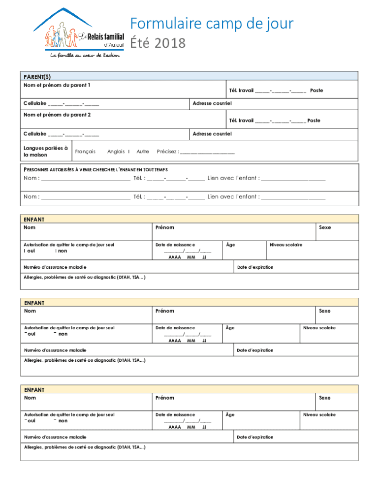Obtenir le gratuit Formulaire camp de jour - Le Relais Familial d'Auteuil
