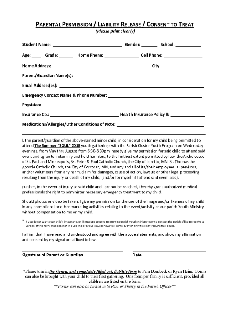 PARENTAL PERMISSION / LIABILITY RELEASE / CONSENT TO TREAT (Please print clearly) Student Name: Gender: School: Age: Grade: Home Phone: Cell Phone: Home Address: City Parent/Guardian Name(s): Email