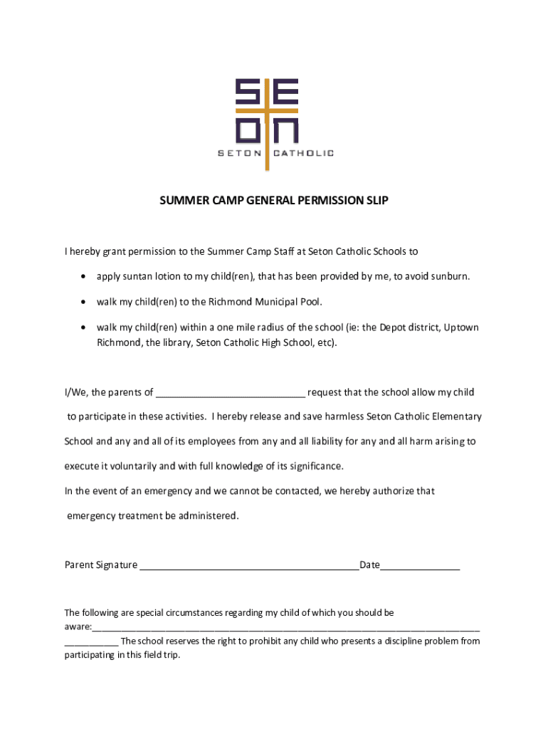SUMMER CAMP GENERAL PERMISSION SLIP hereby grant permission to the Summer Camp Staff at Seton Catholic Schools to apply suntan lotion to my child(men), that has been provided by me, to avoid sunburn.
