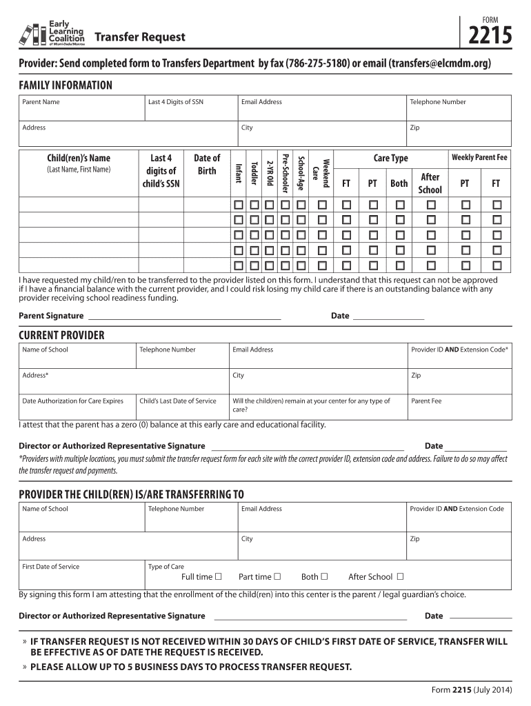 The Early Learning Coalition Transfer Request Form 2215 is a crucial tool for parents in Miami-Dade and Monroe counties when requesting transfers between early learning providers. Submitting this form ensures that transitions in child care are official and comply with state regulations. The form requires specific signatures from both parents and providers, emphasizing its importance in maintaining a clear and accountable transfer process.