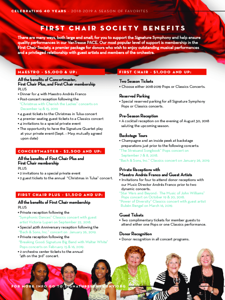 C E L E B R AT I N G 4 0 Y E A R S 2 0 1 8 2 0 1 9 A S E A S O N O F AV O R I T ES FIRST CHAIR SOCIETY BENEFITS There are many ways, both large and small, for you to support the Signature Symphony