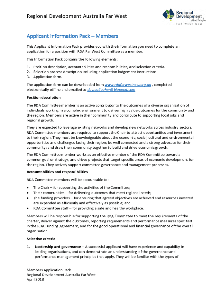 Regional Development Australia Far WestApplicant Information Pack Members This Applicant Information Pack provides you with the information you need to complete an application for a position with