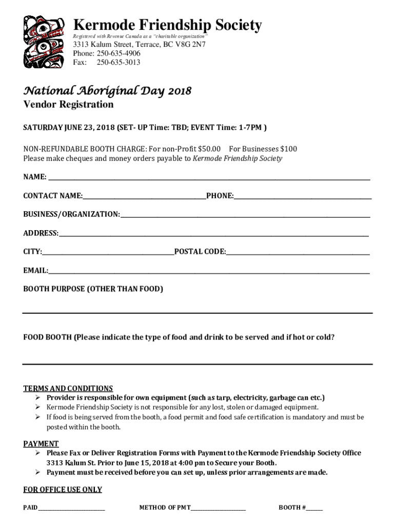 Erode Friendship Society Registered with Revenue Canada as a charitable organization3313 Alum Street, Terrace, BC V8G 2N7 Phone: 2506354906 Fax: 2506353013National Aboriginal Day 2018 Vendor Registration