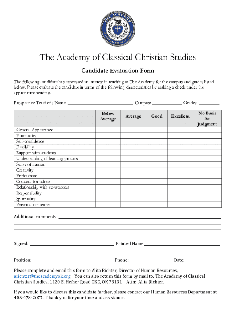The Academy of Classical Christian Studies Candidate Evaluation Form The following candidate has expressed an interest in teaching at The Academy for the campus and grades listed below. Please evaluate