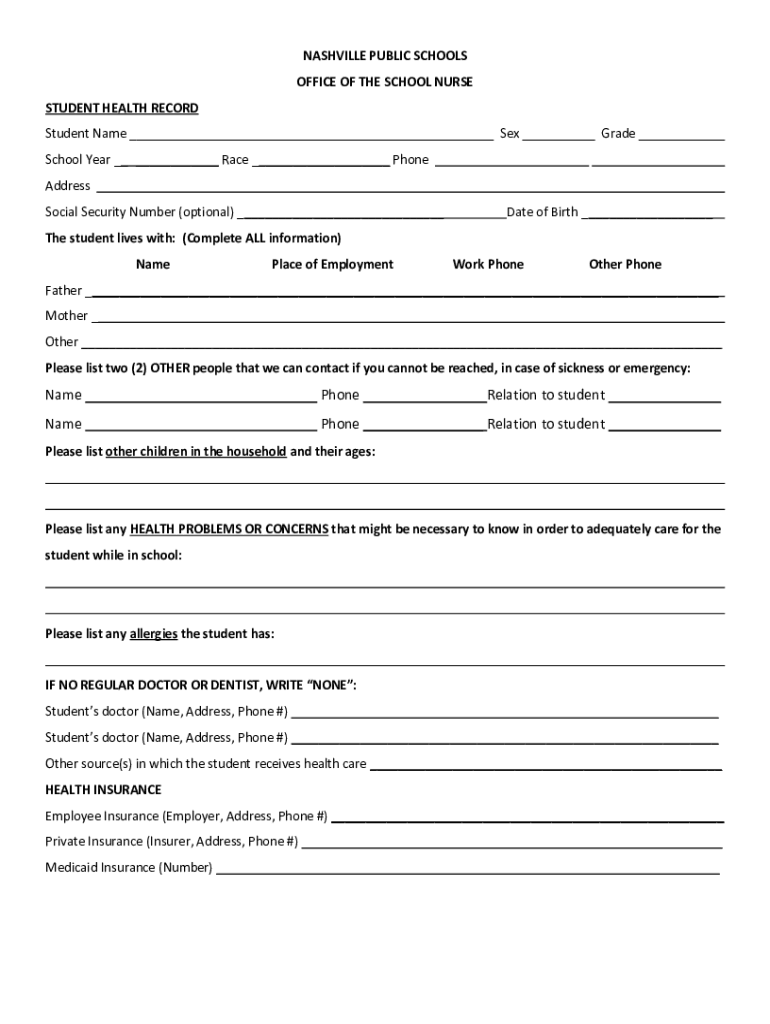 NASHVILLE PUBLIC SCHOOLS OFFICE OF THE SCHOOL NURSE STUDENT HEALTH RECORD Student Name Sex Grade School Year Race Phone Address Social Security Number (optional) Date of Birth The student lives with: