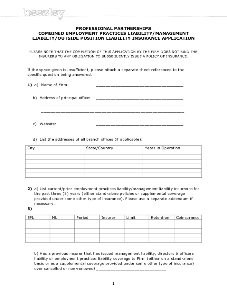 PROFESSIONAL PARTNERSHIPS COMBINED EMPLOYMENT PRACTICES LIABILITY/MANAGEMENT LIABILITY/OUTSIDE POSITION LIABILITY INSURANCE APPLICATION PLEASE NOTE THAT THE COMPLETION OF THIS APPLICATION BY THE FIRM