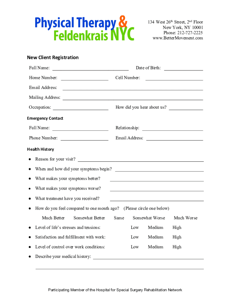 134 West 26th Street, 2nd Floor New York, NY 10001 Phone: 2127272225 www.BetterMovement.comNew Client Registration Full Name:Date of Birth:Home Number:Cell Number:Email Address: Mailing Address: Occupation:How