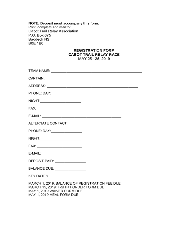 NOTE: Deposit must accompany this form. Print, complete and mail to:Cabot Trail Relay Association P.O. Box 675 Bad deck NS B0E 1B0 REGISTRATION FORM CABOT TRAIL RELAY RACE MAY 25 25, 2019 TEAM NAME: