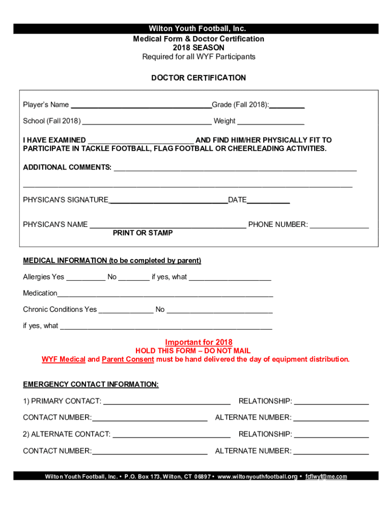 Wilton Youth Football, Inc. Medical Form & Doctor Certification 2018 SEASON Required for all WWF Participants DOCTOR CERTIFICATION Players Name Grade (Fall 2018): School (Fall 2018) Weight I HAVE