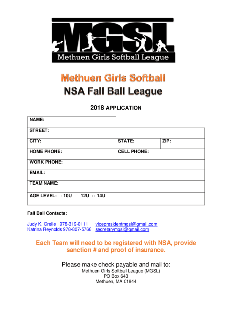 2018 APPLICATION NAME: STREET: CITY:STATE:HOME PHONE:CELL PHONE:ZIP:WORK PHONE: EMAIL: TEAM NAME: AGE LEVEL: 10U 12U 14UFall Ball Contacts: Judy K. Grille 9783190111 vicepresidentmgsl gmail.com Katrina