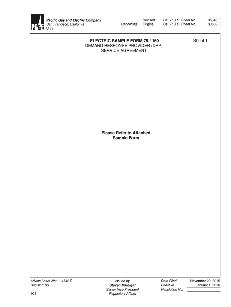 Pacific Gas and Electric Company San Francisco, California U 39 Cancelling Revised Original Cal. P.U.C. Sheet No. Cal. P.U.C. Sheet No. ELECTRIC SAMPLE FORM 791160 DEMAND RESPONSE PROVIDER (DRP) SERVICE