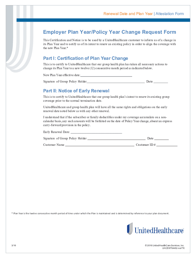 Renewal Date and Plan Year Attestation FormEmployer Plan Year/Policy Year Change Request Form This Certification and Notice is to be used by a UnitedHealthcare customer to inform us of a change in