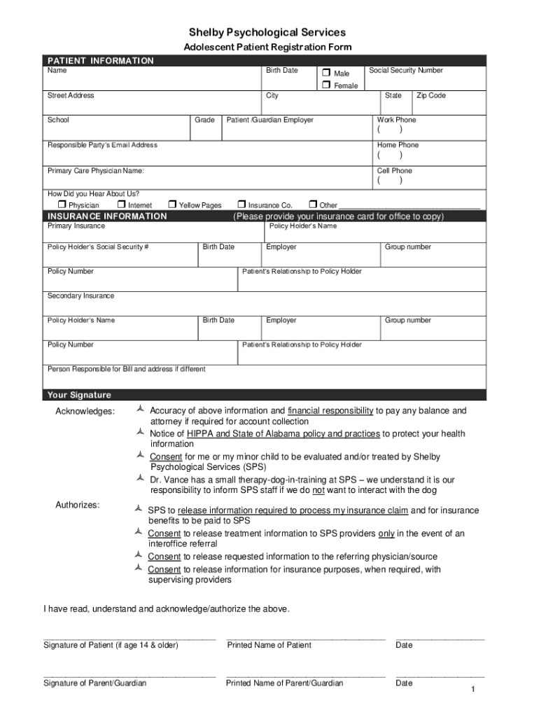 Shelby Psychological Services Adolescent Patient Registration Form PATIENT INFORMATION Rebirth Backstreet AddressCitySchoolGrade Male FemaleSocial Security Number StatePatient /Guardian EmployerWork