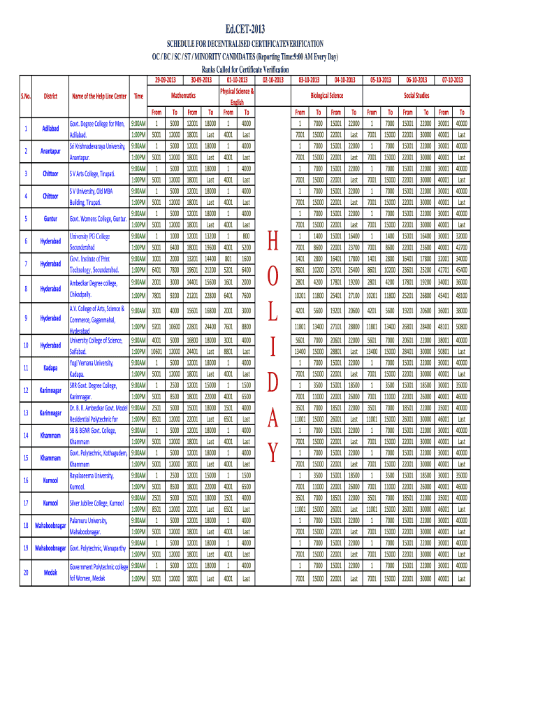 Ed.CET-2013 SCHEDULE FOR Decentralized CERTIFICATEVERIFICATION OC / BC / SC / ST / MINORITY CANDIDATES (Reporting Time:9:00 AM Every Day) Ranks Called for Certificate Verification 29-09-2013 S. No.