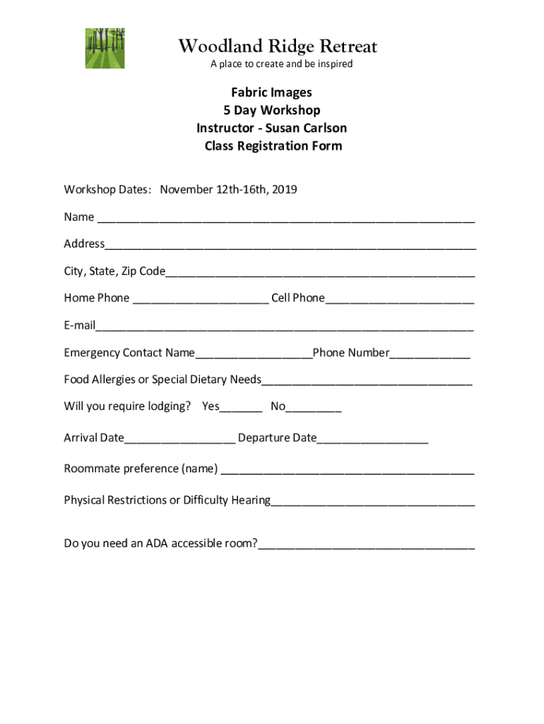 Woodland Ridge Retreat A place to create and be inspiredFabric Images 5 Day Workshop Instructor Susan Carlson Class Registration Form Workshop Dates: November 12th16th, 2019 Name Address City, State,