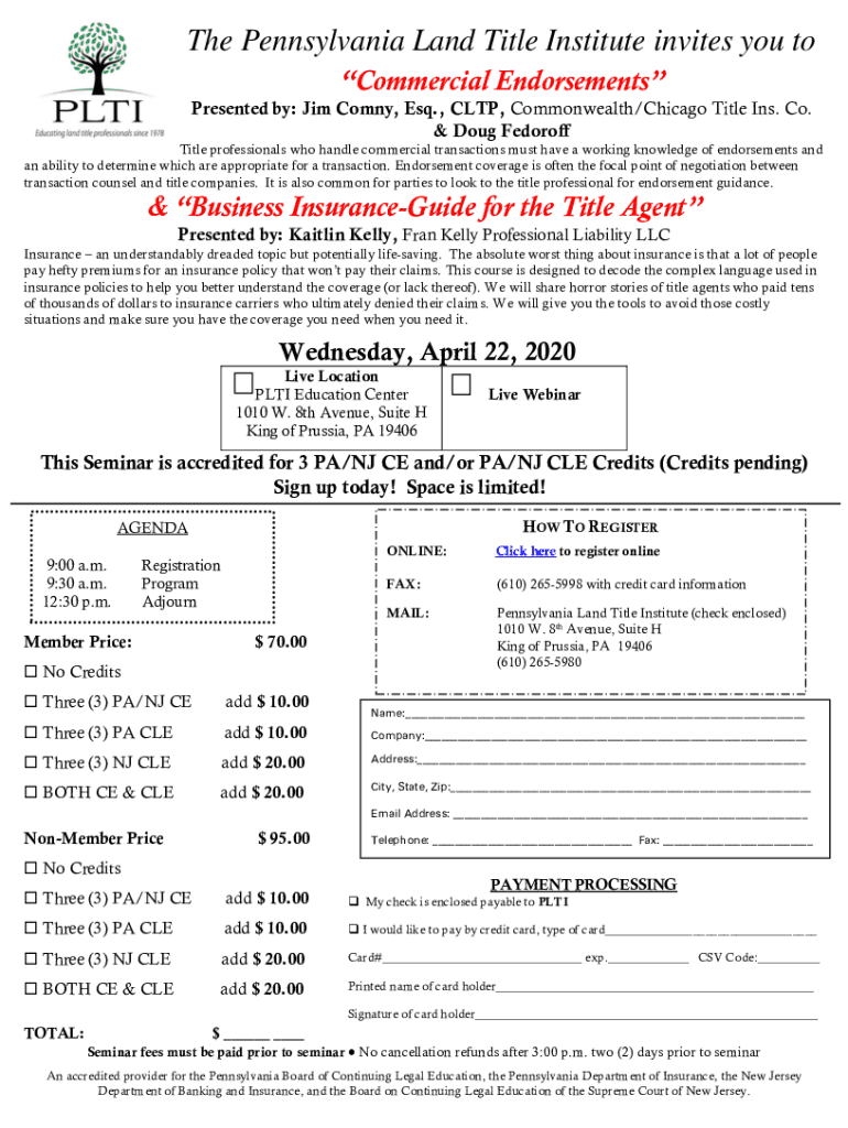 The Pennsylvania Land Title Institute invites you to Commercial Endorsements Presented by: Jim Corny, Esq., CLIP, Commonwealth/Chicago Title Ins. Co. & Doug Fedora Title professionals who handle commercial