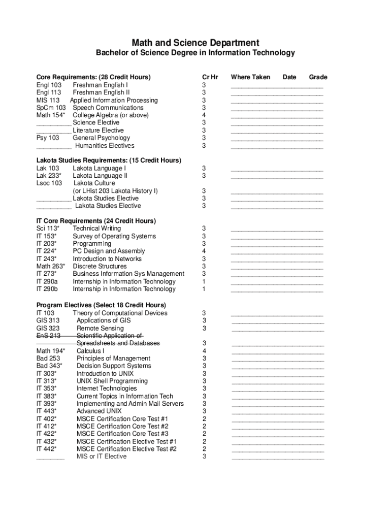 Math and Science Department Bachelor of Science Degree in Information Technology Core Requirements: (28 Credit Hours) EGL 103 Freshman English I EGL 113 Freshman English II MIS 113 Applied Information