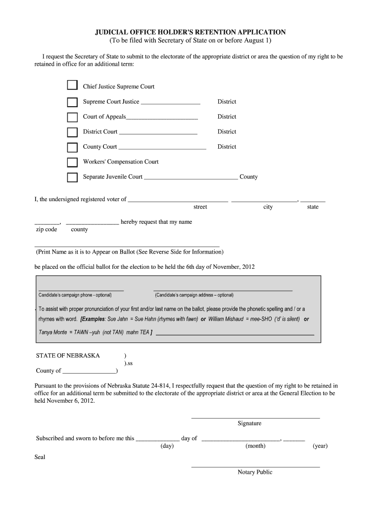 Get the free JUDICIAL OFFICE HOLDER'S RETENTION APPLICATION (To be ... - sos ne