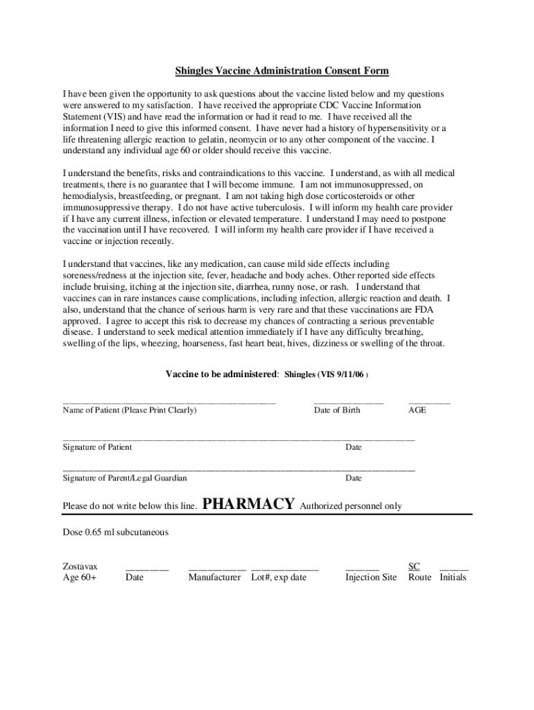 Shingles vaccine administration consent is a form that patients must sign to give permission for the administration of the shingles vaccine. It confirms that the patient understands the vaccine's purpose, potential risks, and benefits.