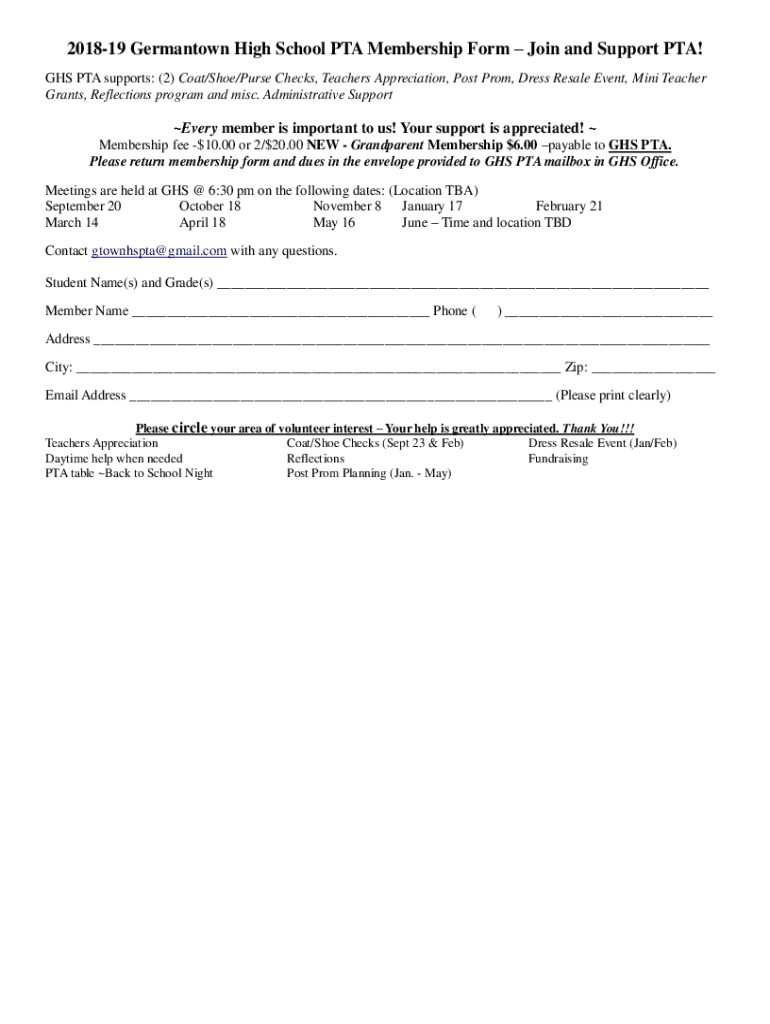 201819 Germantown High School PTA Membership Form Join and Support PTA! GHS PTA supports: (2) Coat/Shoe/Purse Checks, Teachers Appreciation, Post Prom, Dress Resale Event, Mini Teacher Grants, Reflections