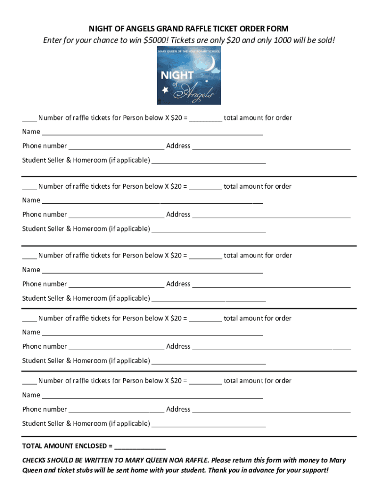 NIGHT OF ANGELS GRAND RAFFLE TICKET ORDER FORM Enter for your chance to win $5000! Tickets are only $20 and only 1000 will be sold! Number of raffle tickets for Person below X $20 total amount for