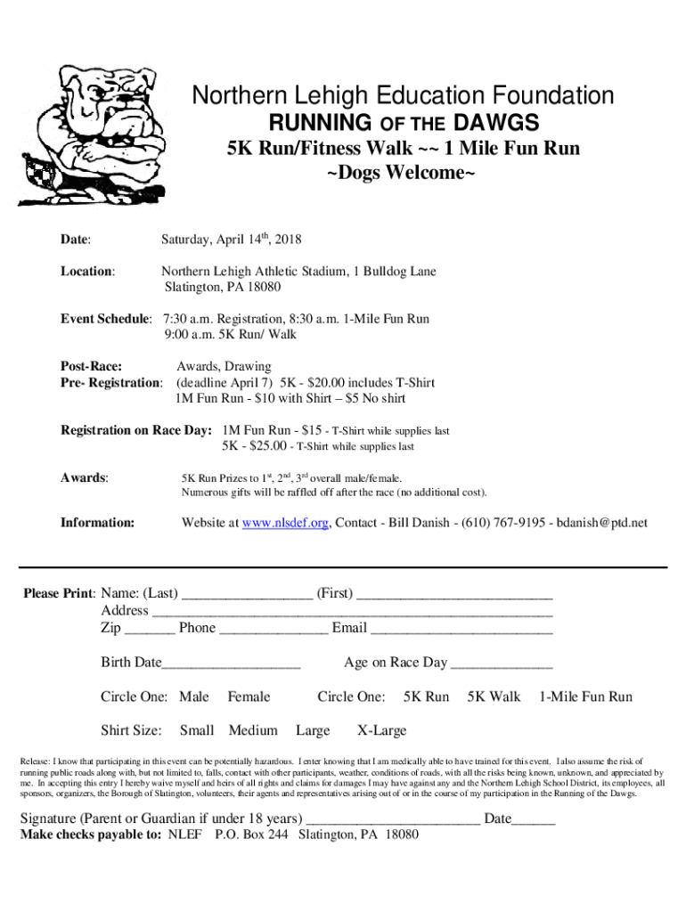 Northern Leigh Education Foundation RUNNING THEDAWGS5K Run/Fitness Walk 1 Mile Fun Run Dogs Welcome Date:Saturday, April 14th, 2018Location:Northern Leigh Athletic Stadium, 1 Bulldog Lane Slating