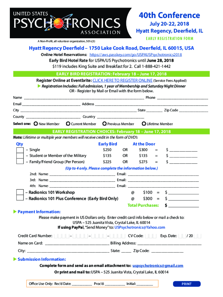 40th Conference July 2022, 2018 Hyatt Regency, Deerfield, IL EARLY REGISTRATION FORM Nonprofit, all volunteer organization, 501c(3)Hyatt Regency Deerfield 1750 Lake Cook Road, Deerfield, IL 60015,